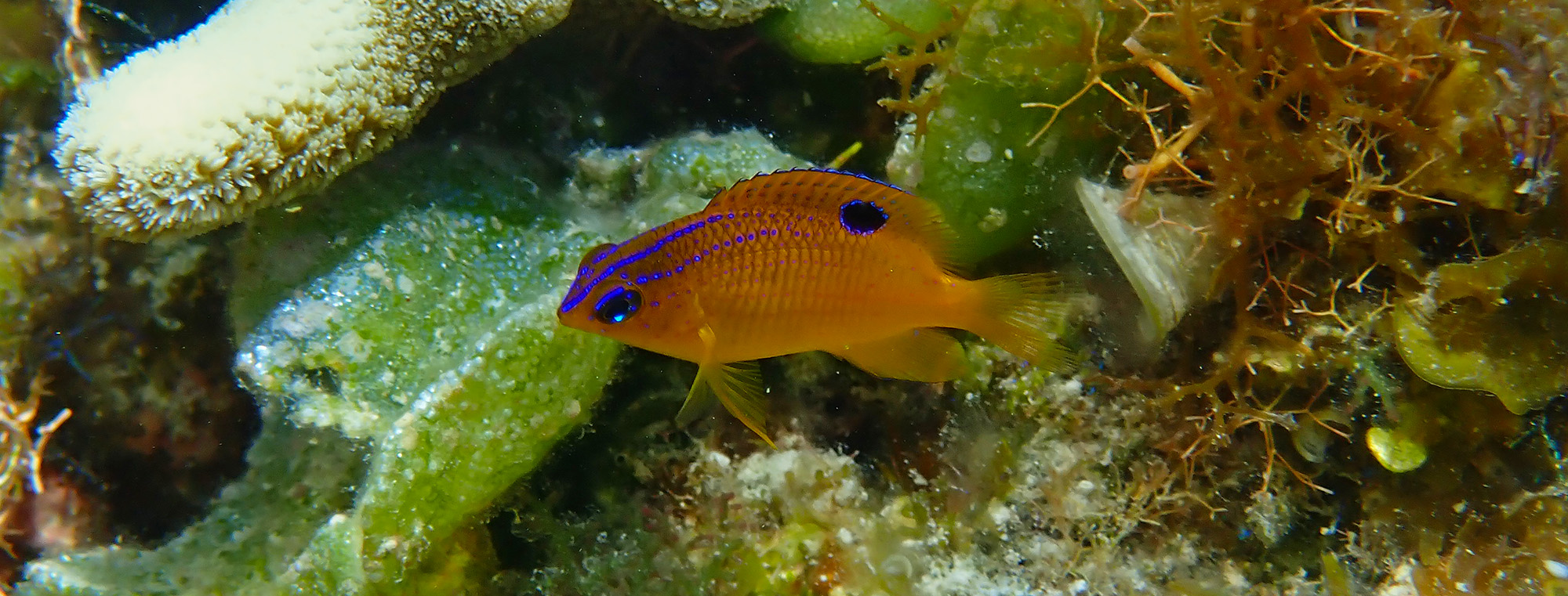 Back at Glover's ReefJuvenile fishes are particularly appealing, wrapped in bright colors and delightfully tiny, like this Cocoa Damselfish