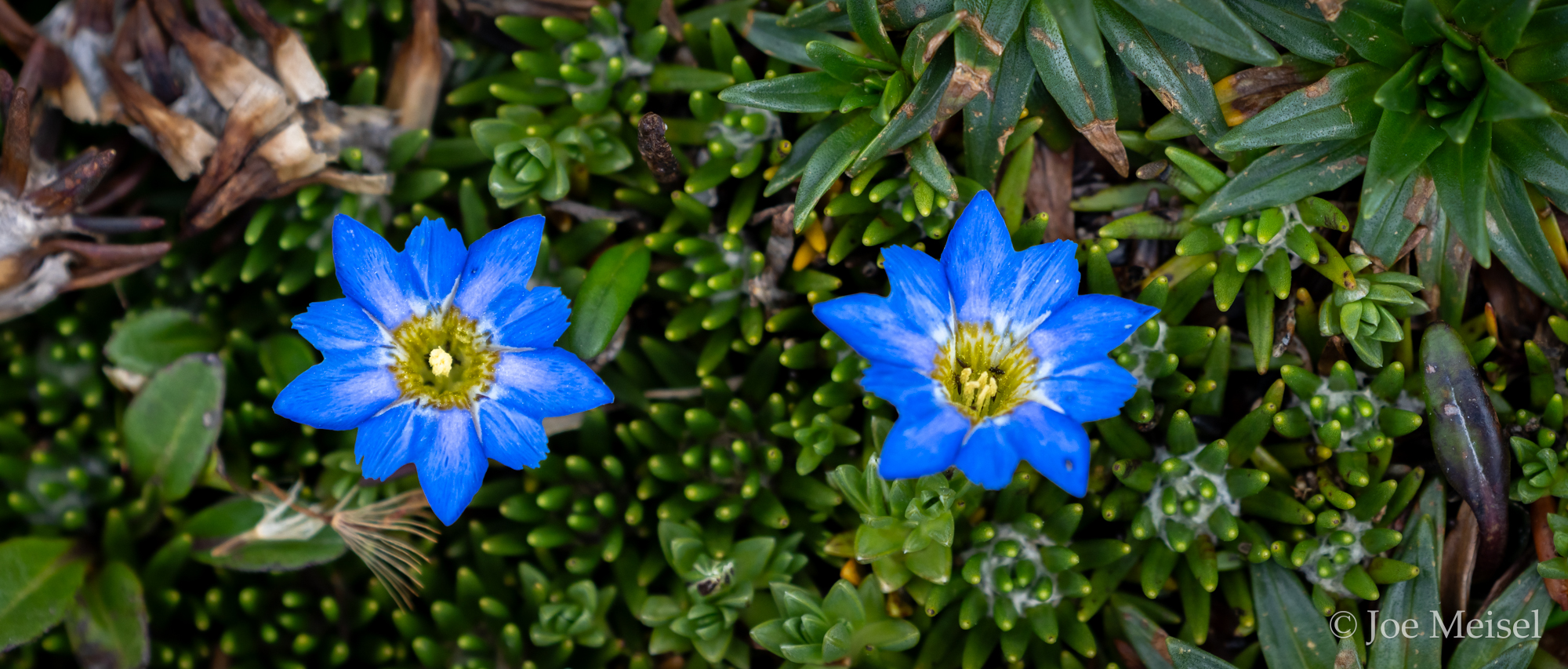 The plant life is spectacular, with lumpy, green cushion plants here and there pierced by fireworks of color, like these Gentian flowers (Gentiana sedifolia)