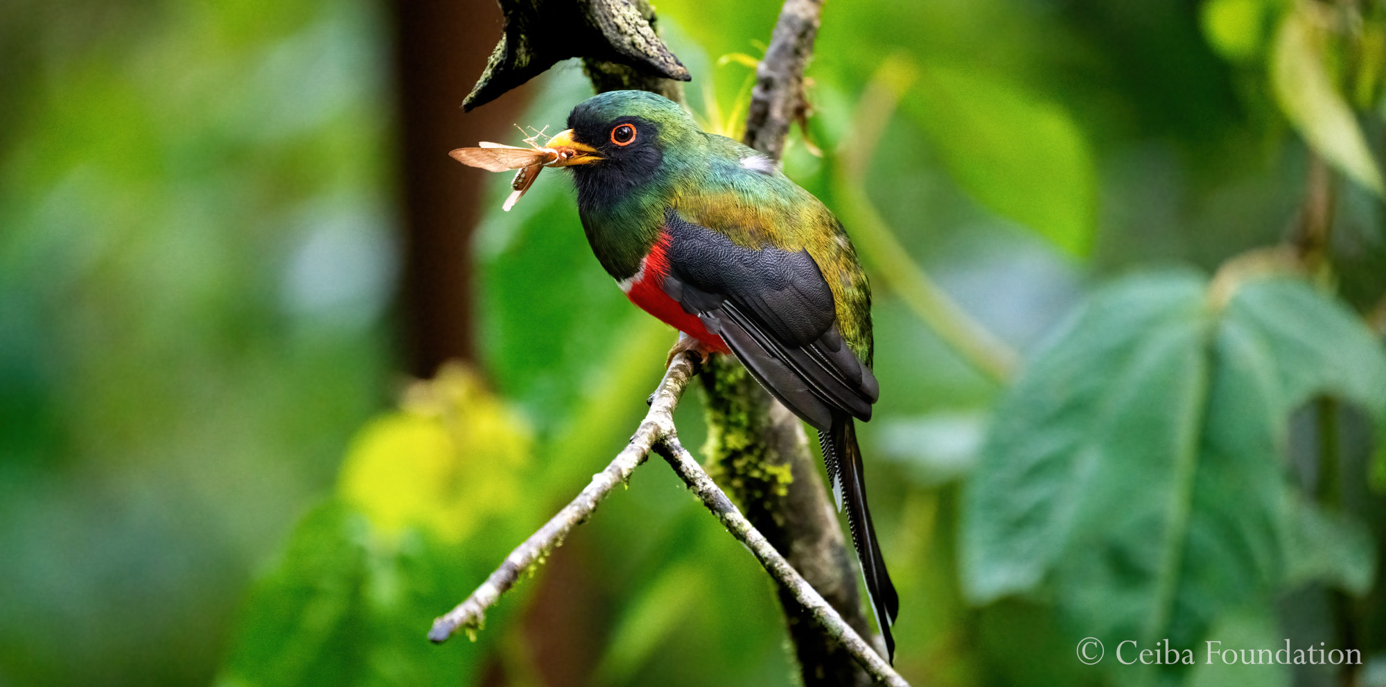 Here a Masked Trogon male defies his bird-book description as a frugivore, and instead chomps on a delicious moth